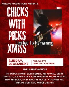 Chicks with Picks at the Alcove in Vancouver, BC was a blast last Sunday December 7th! The music from the songwriters in the round to the rocking full bands was great from start to finish. The crowd responded enthusiastically to my original set. The room was most likely sold out and packed to the rafters. We raised money for a youth drum scholarship as well as money for the SPCA. It was wonderful evening with an attentive and receptive audience and a fun venue. And KD Lang was in attendance for some of the show. Can’t wait for the next one!